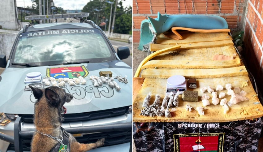 A ocorrência foi registrada no bairro Mutirão, após informações indicarem que um imóvel sem uso estaria sendo utilizado como ponto de armazenamento e distribuição. Durante a verificação no endereço, os agentes contaram com o apoio de cães farejadores, que auxiliaram na identificação do material.