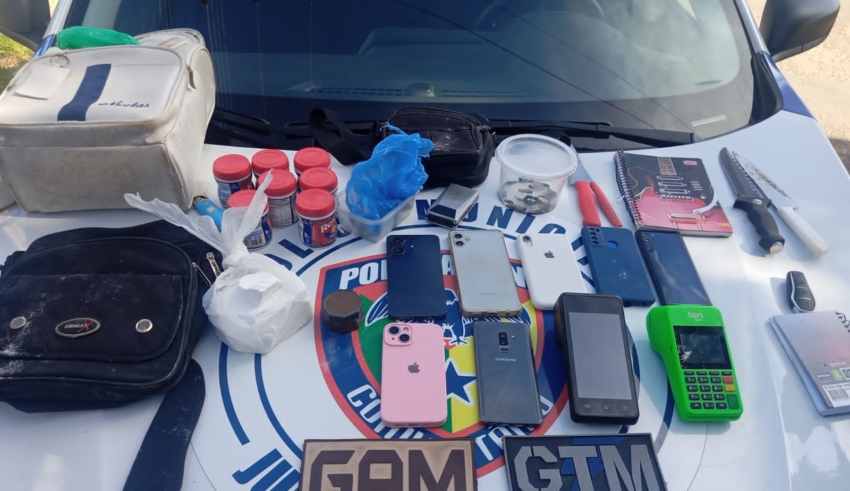 No local onde o veículo estava sendo guardado, os agentes encontraram diversos materiais, incluindo oito aparelhos celulares, duas maquinetas de cartão e uma agenda com anotações. Também foram apreendidas substâncias que apresentam características semelhantes a entorpecentes, além de materiais utilizados para manipulação de drogas.