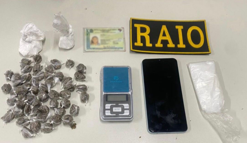 Durante a fuga, o suspeito abandonou uma bolsa no local. O objeto foi recolhido e, após vistoria, foram encontrados um aparelho celular, uma balança de precisão, um documento de identificação feminino e porções de substâncias semelhantes à maconha e à cocaína. O material entorpecente apreendido totalizou aproximadamente 51 gramas de maconha e 59 gramas de cocaína.