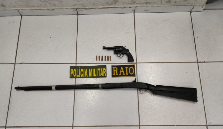 Diante das informações, os policiais solicitaram apoio da equipe do Policiamento Ostensivo Geral (POG) e se dirigiram ao local indicado. Ao avistar os agentes, o suspeito fugiu pela vegetação, abandonando um saco. No interior, foram encontradas duas armas: um revólver calibre .38, com seis munições intactas, e uma espingarda artesanal tipo socadeira.