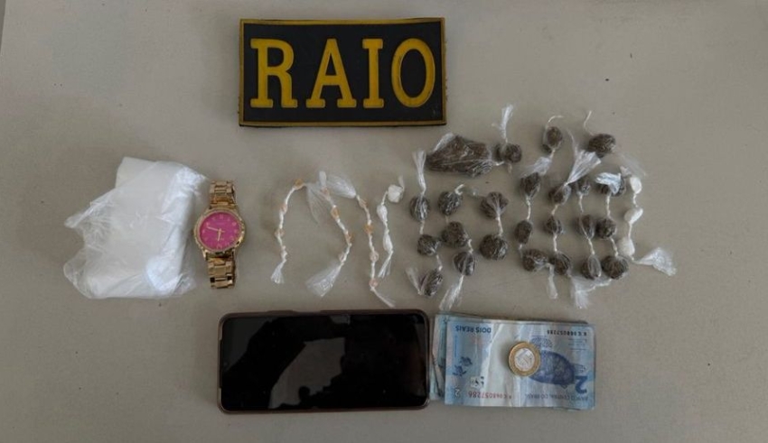 Da entrada da casa, os policiais visualizaram uma mesa na sala com entorpecentes expostos. Em seguida, a jovem que tentou entrar na residência foi abordada e, ao ser questionada sobre um volume sob a roupa, admitiu que carregava drogas.