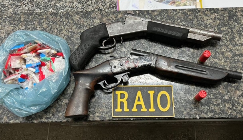 Foram apreendidas duas espingardas calibre 12, de fabricação artesanal, além de papelotes de crack, maconha e cocaína, totalizando cerca de 63 gramas de drogas, e duas munições intactas.