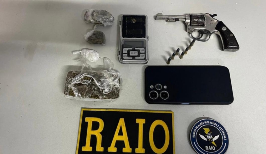 Durante a ação, agentes que atuavam na parte posterior do imóvel perceberam que porções de drogas foram arremessadas por cima do muro, sendo recolhidas em seguida. No interior da residência, as buscas localizaram mais entorpecentes, uma balança de precisão, um revólver calibre .22, de acabamento inox e sem numeração aparente, além de um aparelho celular.