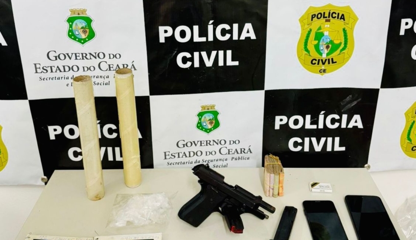 O suspeito foi localizado no bairro Romeirão por equipes da 2ª Delegacia Seccional de Juazeiro do Norte. Durante a abordagem, os policiais apreenderam uma pistola calibre 380, dois carregadores, 22 munições do mesmo calibre, 41 gramas de cocaína, seis gramas de maconha, uma balança de precisão, cartões de crédito, cadernos de anotações, materiais para venda de drogas e aparelhos celulares.