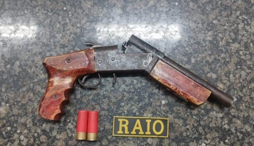 Durante a busca domiciliar, os militares encontraram uma arma de fogo artesanal calibre 12, com dois cartuchos intactos, escondida dentro de um guarda-roupa, envolta em um pano. O suspeito afirmou que a arma seria utilizada apenas para defesa pessoal.