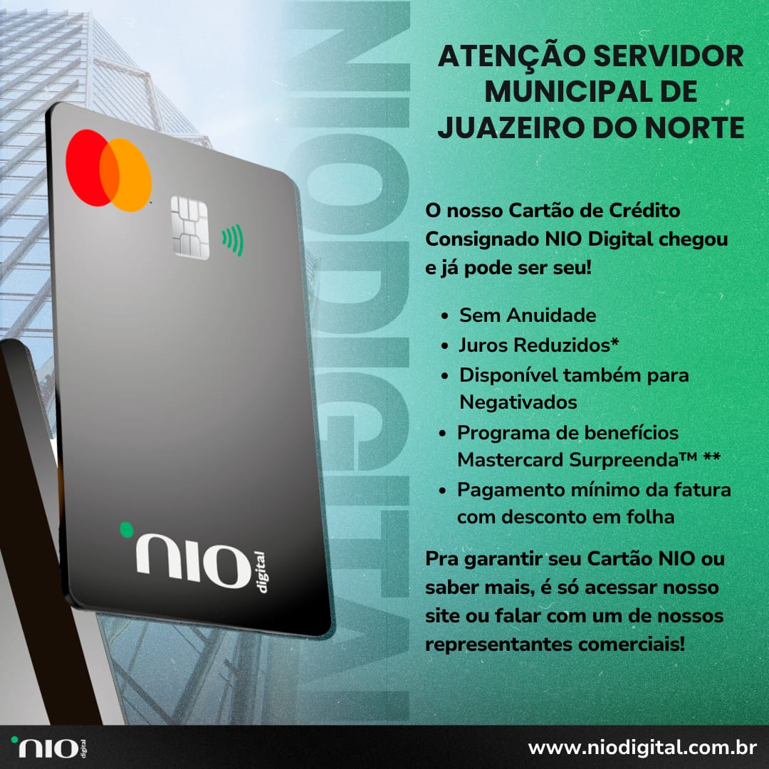 Uma nova oportunidade única para os servidores municipais de Juazeiro do Norte e do Governo do Ceará. A NIO Digital tem convênios firmados e ativos nestes órgãos com o Cartão de Crédito Consignado, que promete mais praticidade, benefícios e condições especiais para quem faz parte do funcionalismo público.