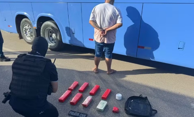 Em Barbalha, um homem de 32 anos foi preso em um ônibus de transporte coletivo intermunicipal na Rodovia CE-060. Ele vinha de Fortaleza com destino ao Crato e foi abordado por equipes da Polícia Civil. Durante a revista, foram encontrados sete tabletes de maconha (pesando cerca de seis quilos), um tablete de aproximadamente um quilo de crack e 716 gramas de cocaína. Além das drogas, também foram apreendidos dois celulares e uma quantia em dinheiro. O suspeito foi conduzido à Delegacia Regional de Juazeiro do Norte, onde foi autuado em flagrante por tráfico ilícito de drogas. Ele permanece à disposição da Justiça.