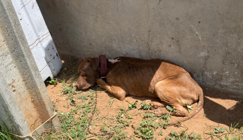Ao chegarem ao endereço informado, os policiais verificaram que o cachorro apresentava sinais evidentes de abandono. O animal estava amarrado a um poste por uma corrente, visivelmente debilitado, com baixo peso e com grande quantidade de parasitas concentrados na região do pescoço, o que indicava ausência de cuidados básicos.