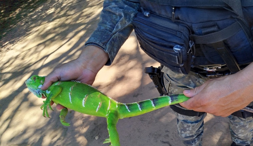 Utilizando os equipamentos adequados para garantir a segurança do animal e da equipe, os policiais conseguiram capturar a iguana, que apresentava bom estado de saúde. Em seguida, o animal foi solto em uma área segura, distante de residências, para garantir sua preservação e bem-estar.