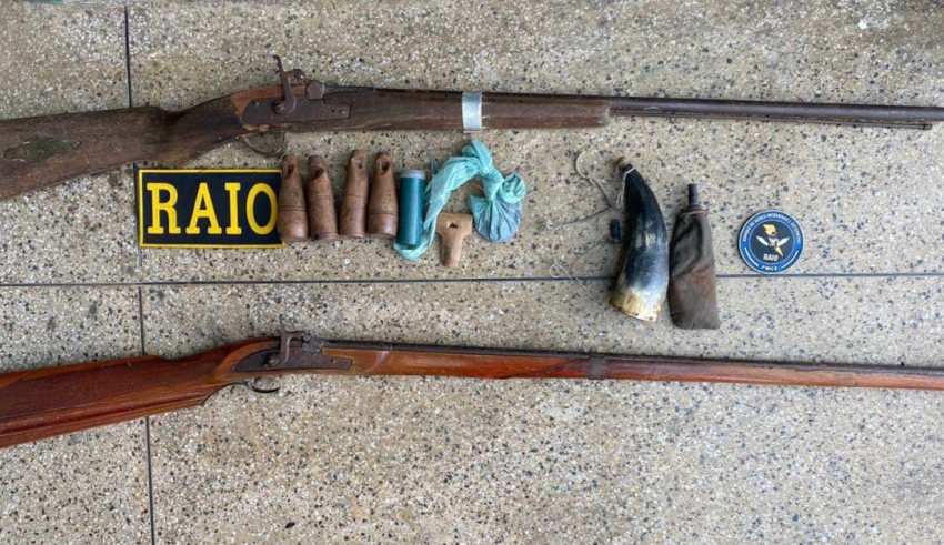 De acordo com informações da equipe RAIO 01, a denúncia foi recebida via WhatsApp, e os policiais se deslocaram imediatamente até o local para averiguar a situação. Ao chegarem na área indicada, a equipe visualizou dois homens armados, um portando uma espingarda artesanal e o outro carregando outra arma semelhante junto com um bornal.