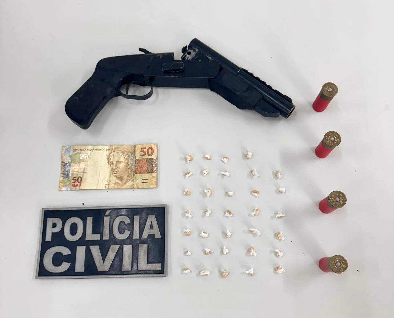 Após verificarem a área, os policiais encontraram uma espingarda calibre .12 municiada, que o suspeito havia tentado descartar com a chegada da equipe. Dentro do imóvel, foram localizadas mais três munições do mesmo calibre e diversas pedras de crack embaladas para comercialização.