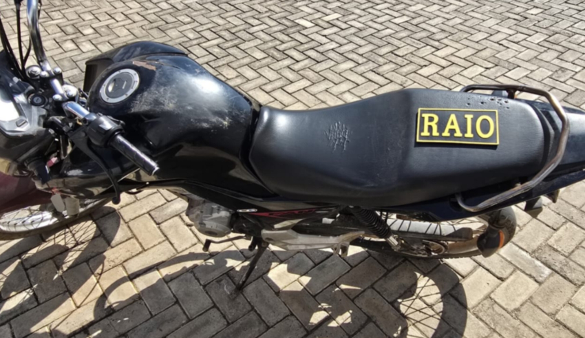 Ao chegar ao local, os policiais localizaram uma Honda CG Fan 160, de cor preta, ano 2020 e placa POI-2675, escondida em meio ao matagal. A placa apresentava divergências, e após consulta pelo chassi foi confirmada restrição de roubo/furto.