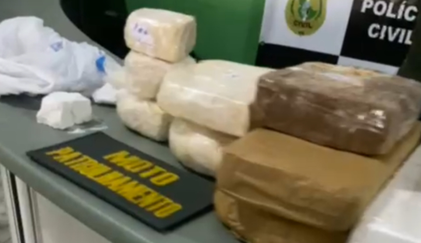 Dando continuidade à ocorrência, os policiais se deslocaram até a residência do indivíduo, situada na Avenida Carlos Cruz, onde, segundo a PM, foi localizada uma grande quantidade de entorpecentes, entre eles pó branco análogo à cocaína e pedras de crack.